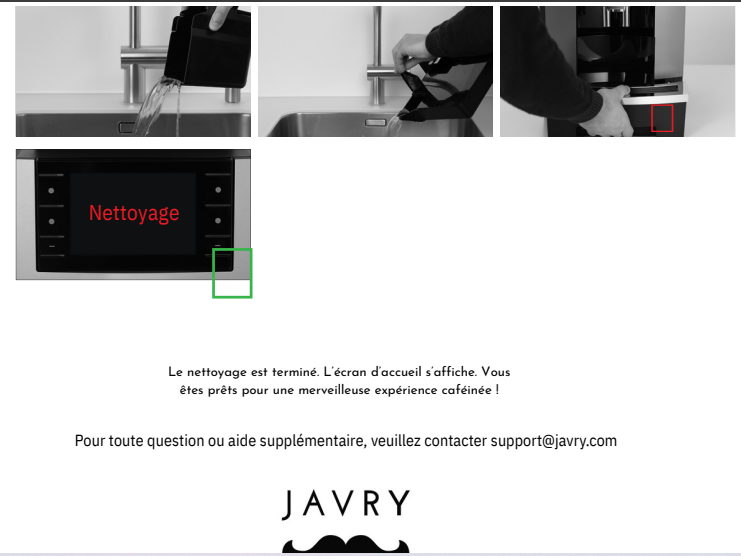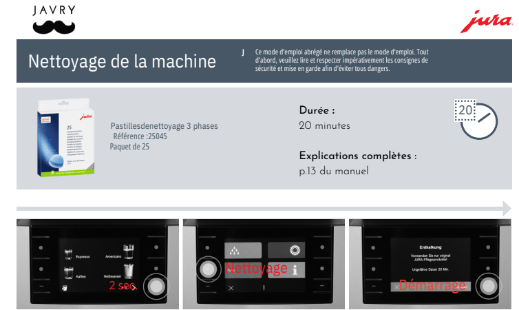 - Javry préconise l'usage des pastilles détergentes Jura ou Solute pour nettoyer votre machine. L'usage d'autres produits pourrait endommager votre machine.
