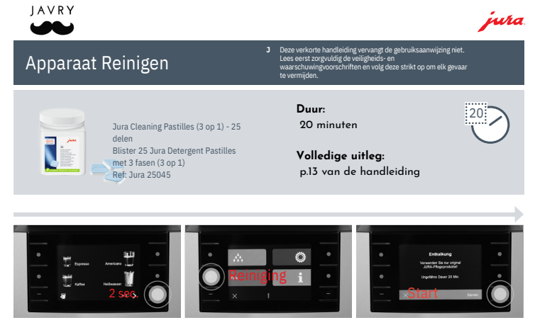 3. Javry raadt het gebruik aan van Jura- of Solute-reinigingstabletten om uw machine schoon te maken. Het gebruik van andere producten kan uw machine beschadigen.